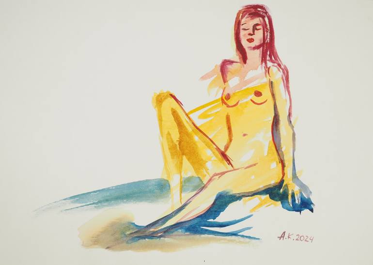 This small watercolor sketch is painted in an expressive manner, directly with a brush, without using a pencil. Yellow and burgundy strokes create a cozy warm range. Blue emphasizes the shadows. The woman with closed eyes smiles tenderly, it is clear that she is happy.