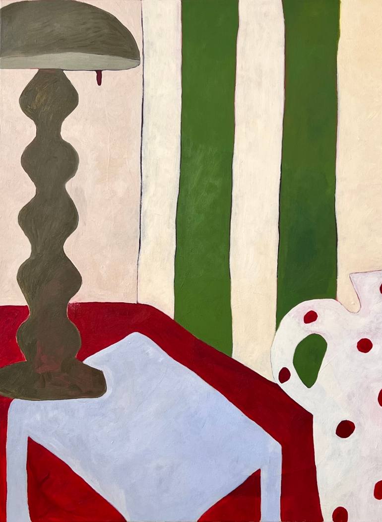 ‘In the Corner’ showcases a serene interior characterised by warm tones, subtle geometry, and an eclectic blend of patterns. A small table, a lamp and a spotted jug form a simple arrangement, reduced to gentle shapes and muted colours that convey calmness and character. The striped backdrop and hand...