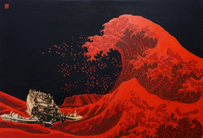 Work is SOLD An image from a newspaper article of a asylum seeker boat sinking from an unfortunate accident, with some rescue boats on either side is about to be devoured by a reversed image of 'The Great Wave off Kanagawa'. Ayers Rock sits in the distance.