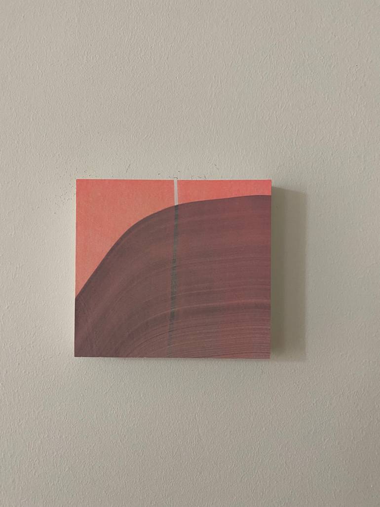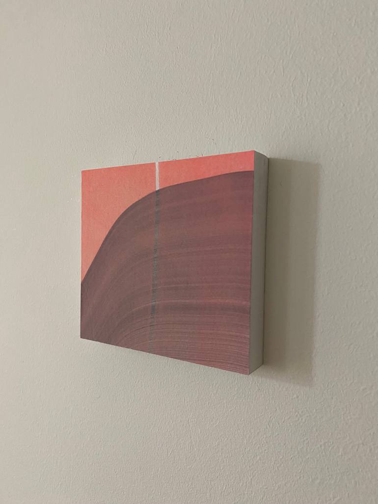 "peach hill" is a charming miniature painting, one in a series of five abstract works. The artist's unique approach involves finding smaller compositions within larger images, a process of treasure hunting that reveals surprising discoveries. Crafted with acrylic on paper, the cutout is carefully m...