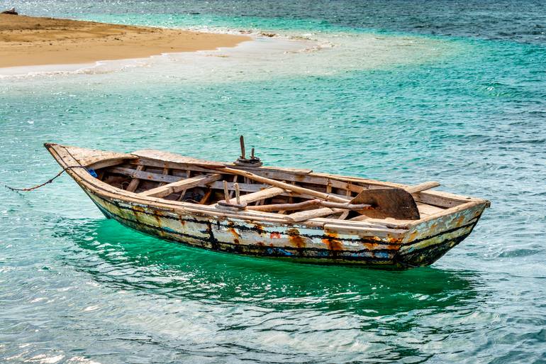 Photo taken on 07/14/2015 Location: Labadee, Haiti. A rustic fisherman’s skiff on the emerald green waters of the Caribbean. Photograph is printed and proofed by artist Mike Ring. It will be packaged and rolled in a tube. Printed on a premium 100% Archival Cold Press Natural Cotton Fine Art Paper. ...
