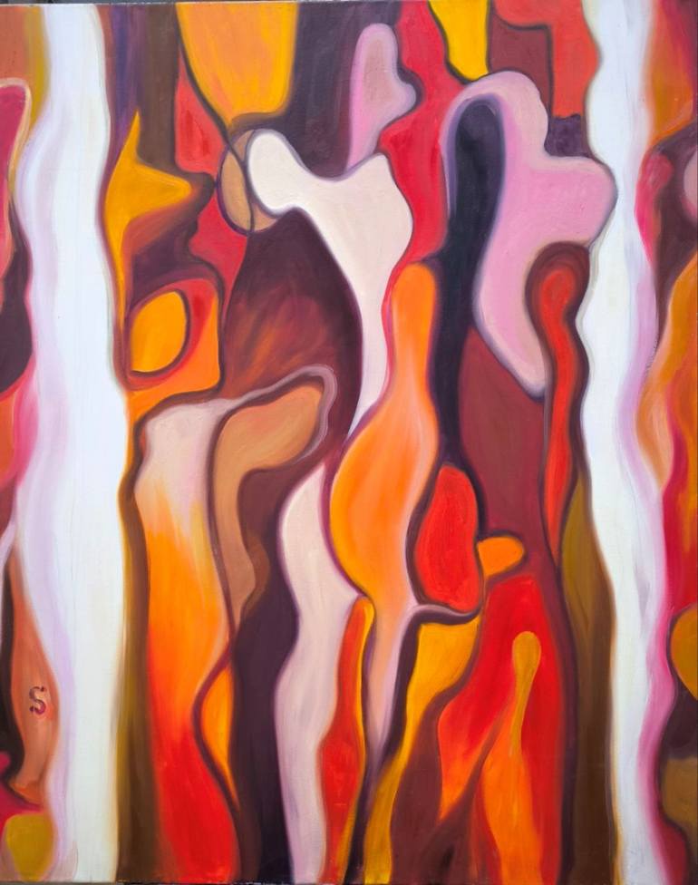 This abstract painting conveys a sense of movement, warmth, and inner energy through smooth contours and a vivid palette of red, orange, yellow, and purple. In the flowing shapes, one might see human silhouettes or emotions blending into each other. The artwork invites the viewer into an introspecti...