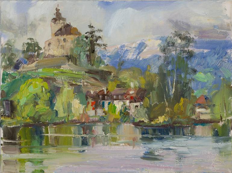 In this landscape painting you can see the pearl of Switzerland - the town of Werdenberg with a lake and a castle on the hill. The spring awakening of nature, the harmony of the beautiful medieval architecture and the surrounding landscape, as well as the excellent artistic presentation give this pi...
