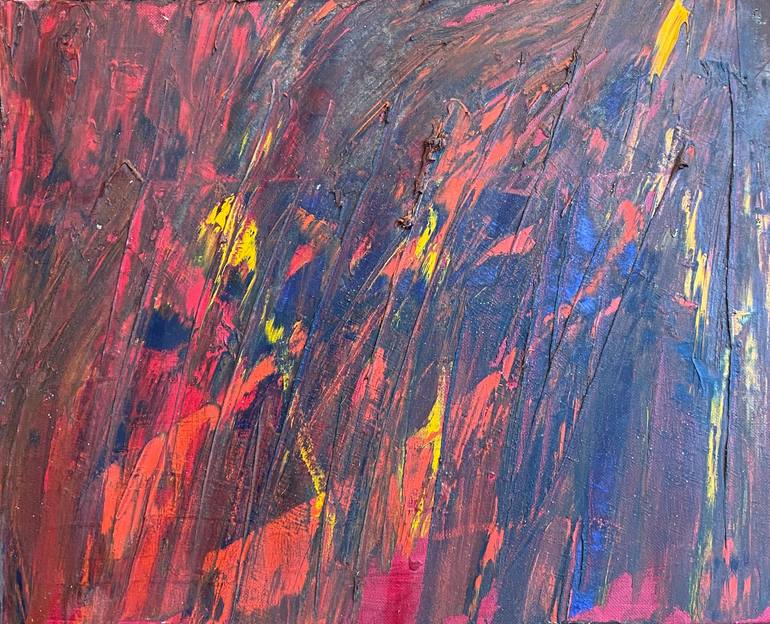 "In Fracture, We Rise" captures the energy of transformation through vibrant acrylics, where bold brushstrokes and palette knives bring the canvas to life. The deep crimson and rich reds clash dramatically, while three golden lines cut through the chaos, symbolizing moments of clarity and strength e...