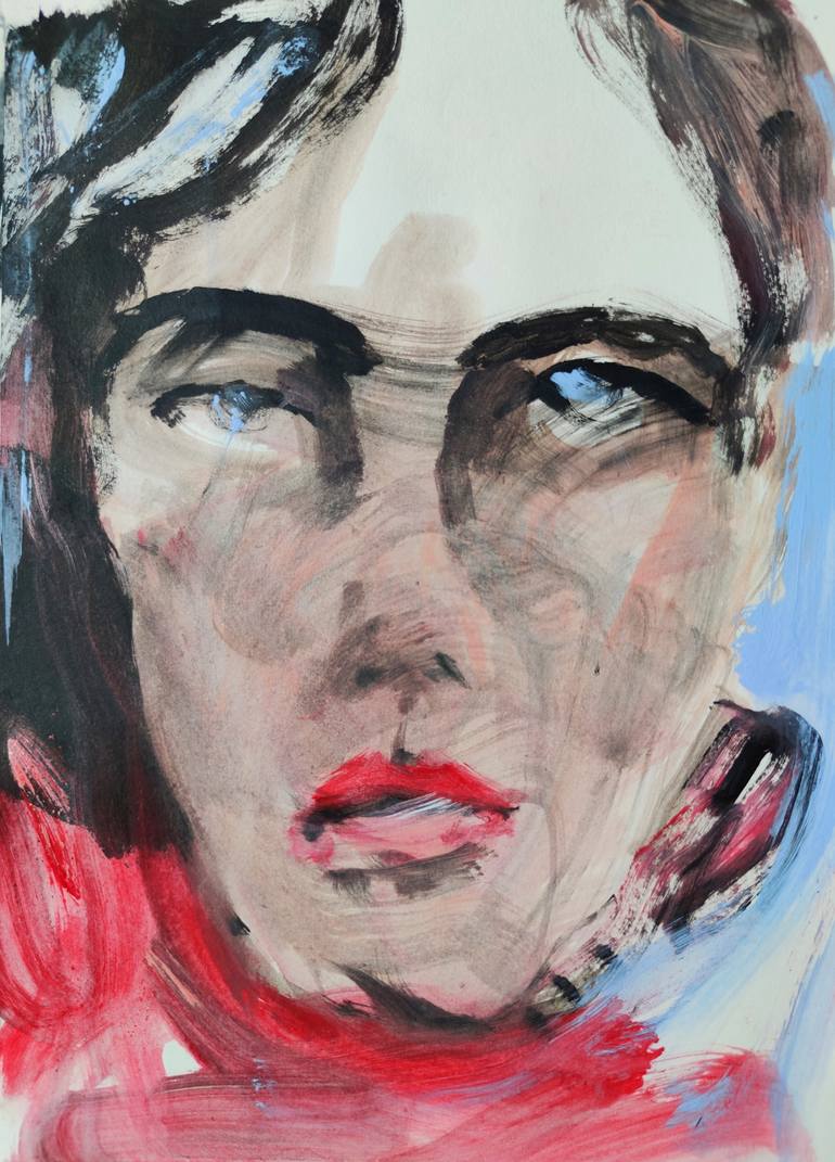 Modern female portrait painting. Original acrylic on off-white paper, 170 gms. Size approx 25x35 cm, 10x14 Inch. Dated and signed on the back.