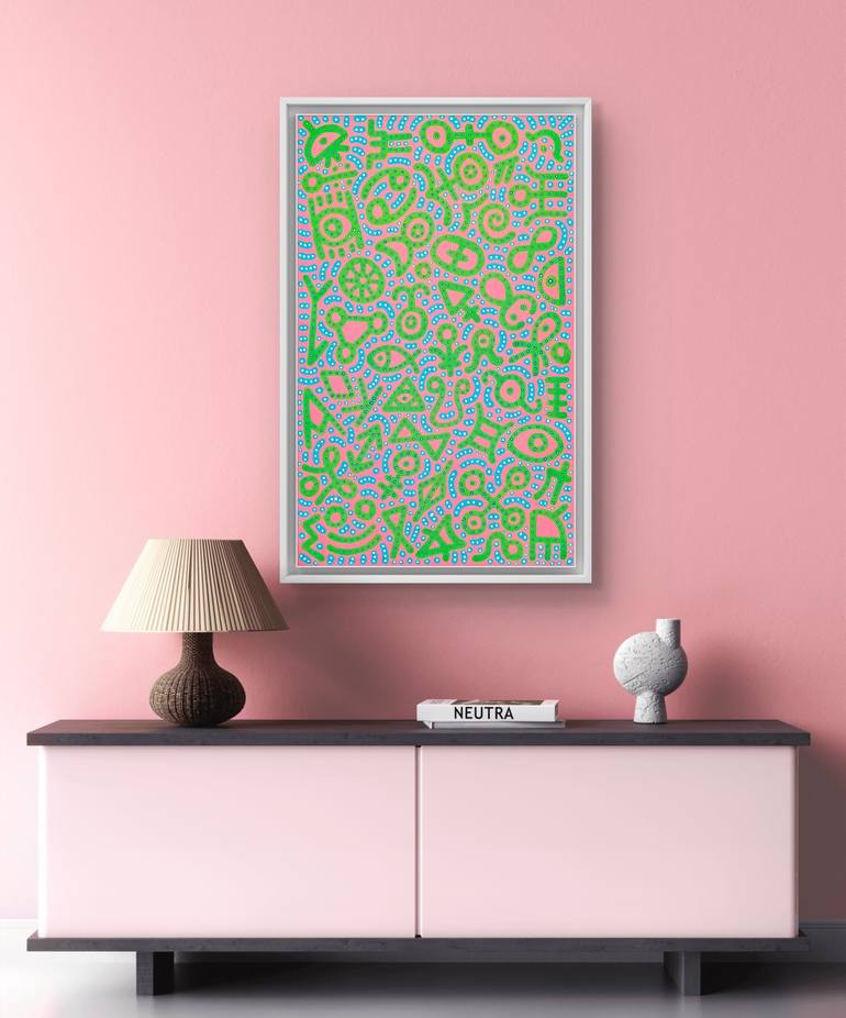Imagine stepping into a universe of symbols where everything feels interconnected, as if each shape and color has something to say about the complexity of invisible connections. This space is filled with fragments of thoughts—watchful eyes, spirals leading to unknown paths, figures repeating as if e...