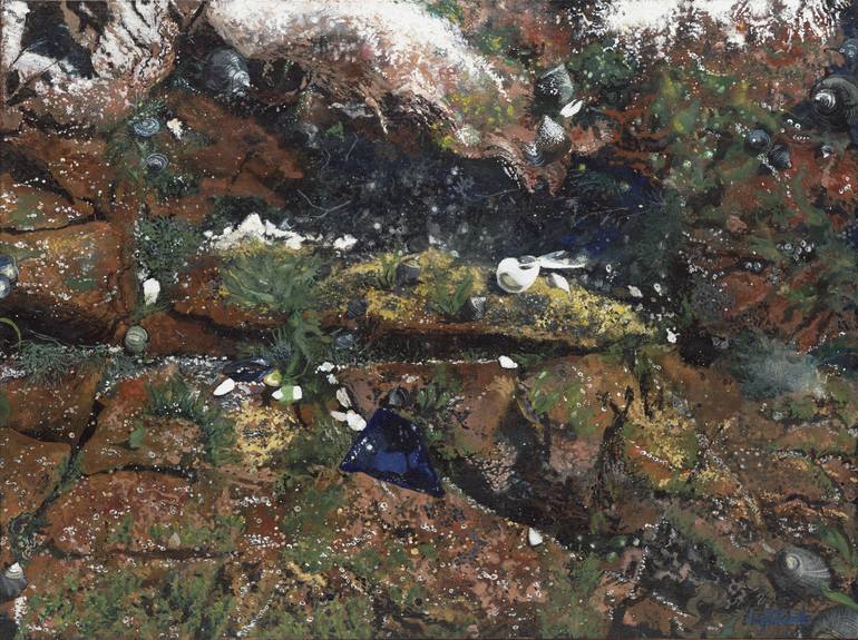 Nature magnification of a spot in a tide pool at Red Rock Park Lynn Massachusetts, including serendipitously a piece of blue seaglass. Wood strip frame stained Mahogany built by the artist.