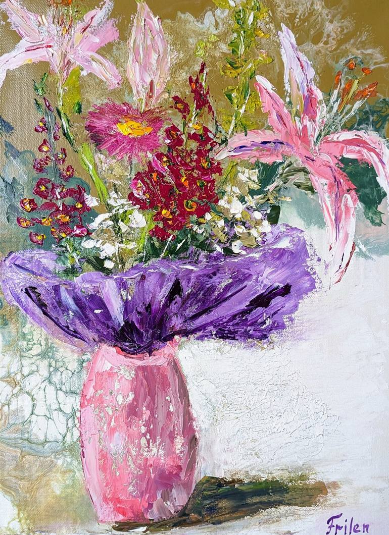 This artwork is created using acrylic pouring as a base and oil paint for textural brushstrokes. The delicate flowers in shades of pink, purple, and white form a composition that radiates the elegance of the past. The jagged strokes give the impression that the bouquet has been "weathered by time," ...