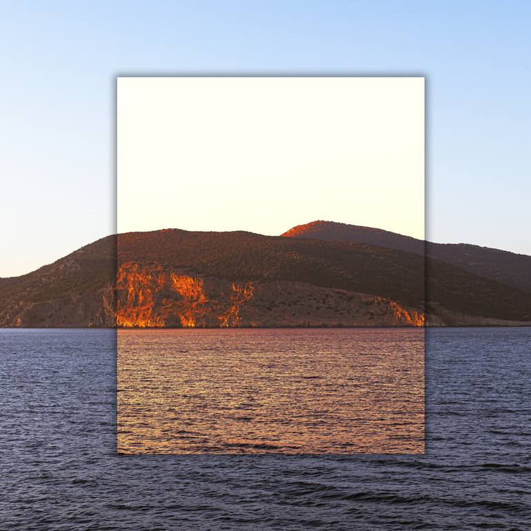 Immerse yourself in the tranquil beauty of "2633," an abstract seascape that captures the serene essence of the sea. This fine art print showcases a stunning sunset over a mountainous horizon, rendered in captivating colors that evoke a sense of peace and wonder. The square format adds a touch of co...