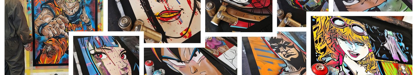 Portuguese based urban artist, works entirely with spray reinterpreting comic book characters from Manga, Marvel, dc, and more with an unique technique that makes his work look like authentic printed posters. Working also on some abstract, and symbolism paintings manipulating new ways to paint with spray, and explore new materials. Graduated from Antonio Arroio College of Art in1996 in Graphic Design, Angolan born in 1978 started by doing graffiti in illegal walls in 1994, an underground graffiti artist known for his stylish tags. After many years living in the shadows he decides that it's time to put his art on canvas so it can be appreciated.