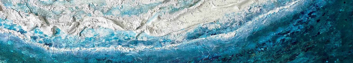 With her use of sea salt and sand her paintings are infused with the elements, which she collects and mixes into her pigments. She instinctively portrays the feeling of a beach, tidal pool, or hidden cove, using texture to capture the momentum of breaking waves.