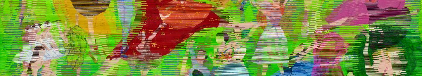 In these works, Park vividly portrays the diverse facial expressions of city dwellers, directing their daily lives through detailed depictions of costumes and belongings. She outlines figures against monochrome backgrounds, enhancing some with intricate fabric patterns. This technique infuses her canvases with lively urban glamour.