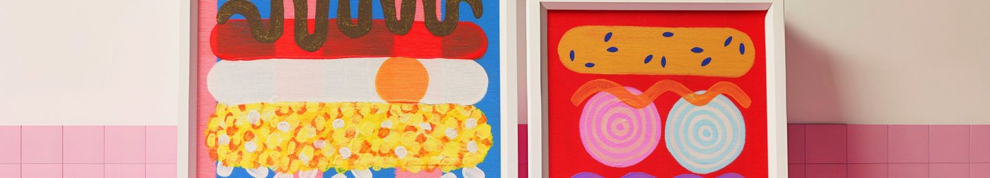 Kasia Sykus is a painter exploring play, movement and imagination through bold abstractions. Her work distills subjects into their simplest forms while keeping them recognizable using shape, colour and brushstroke. Currently, she paints dynamic interpretations of burgers where shifting ingredients and fluid compositions evoke a sense of motion. Influenced by her background in food styling, Kasia embraces spontaneity and the imperfections of the hand-painted process. Her work invites curiosity, reimagining familiar subjects through a lens of joy and exploration.