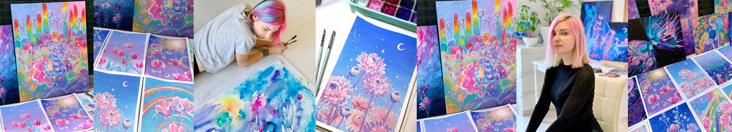 Mistake Ann creates dreamlike surreal worlds that explore emotions, human connection, and cosmic harmony. Her colorful works invite the viewer into a vibrant, otherworldly space filled with love and mystery. She began her artistic journey as a commercial illustrator, occasionally working with watercolors and oils, before fully dedicating herself to her unique surrealist vision.