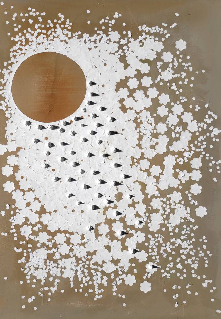 Hundreds of cut flowers and white acrylic drops which shape makes me think of small meringues. Depending on the light, they project a different shadow on the flowers. The flowers are made from used paper sheets saved from the bin. This artwork was made during the Covid 19 lockdown in France.The flor...