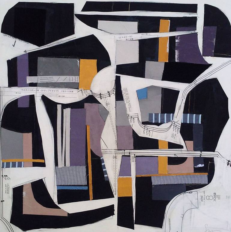 This piece is created with vintage dress patterns, textile and acrylic paint, finished with a matte varnish and framed in an (black) oak frame, ready to hang.