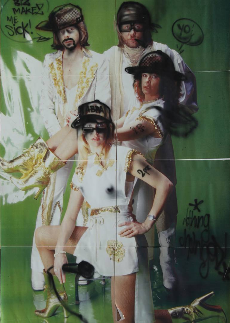 Spraypainting was realized while holding a workshop and showing audience how to paint with a spraycan. With airbrush overpainted Abba poster.