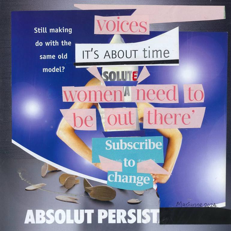 This work is part of Talking Collages Series . "ABSOLUT PERSIST" sums up the encouragement for women to keep trying to achieve what they are worthy of. It was difficult to make this work hold together as there are more words than I wanted in this space. However, I managed to create a cohesive imag...