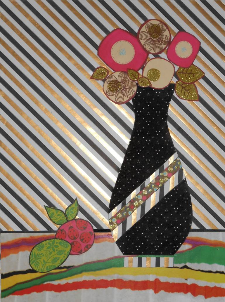 A typical yet whimsical still life of a black vase, some abstract flowers and some fruit against a colorful, striped background.