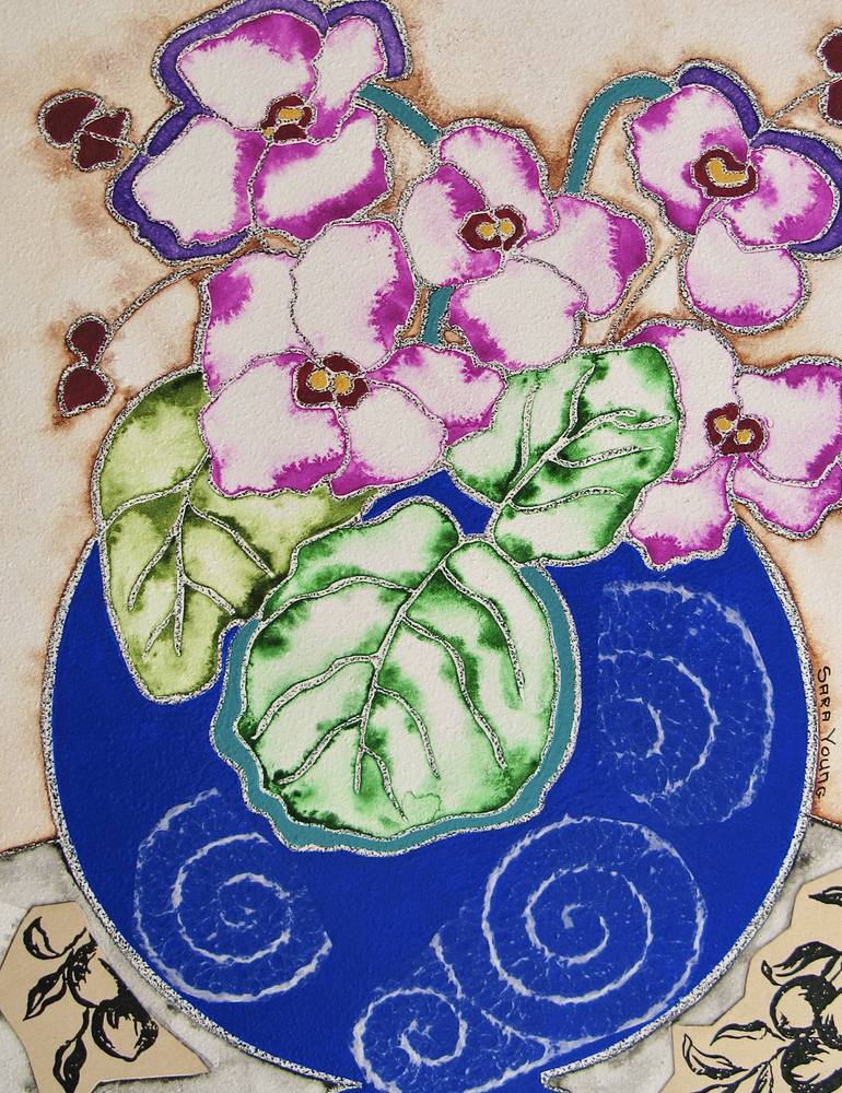 I love African Violets. I always try to have one or two and love to paint them when they are full of blossoms. This piece is a collage created on an Ampersand Aquabord which is a box framed board with a surface designed for watercolor.