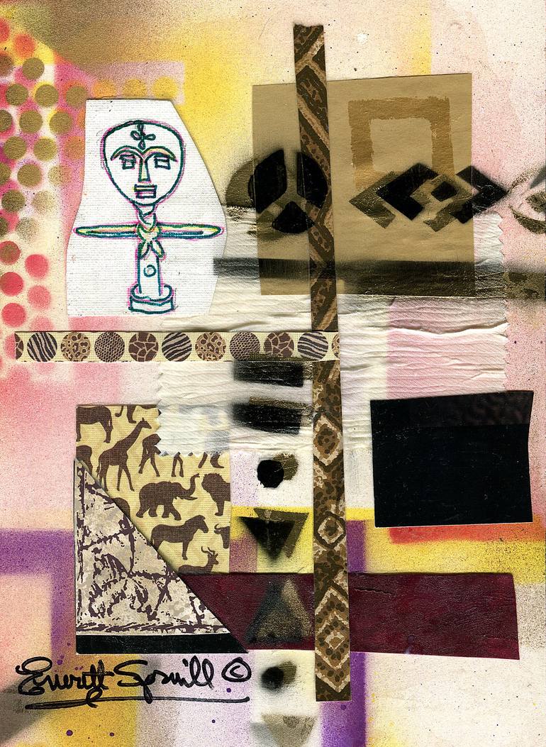 An American painter, photographer, and print-maker, Everett Spruill is an innovator. Born in 1954 in Birmingham, Alabama USA. Everett Spruill attended Berea College, where he majored in Business. It was during this time that he painted watercolor landscapes and portraits in the tradition of the French Impressionist, but did not seriously entertain the idea of a career in the arts. While managing a Hotel in Miami, and with frequent visits to the Miami Museum, a Picasso exhibition changed his mind as he was inspired by the simplicity of the work and the geometric patterns that formed the images. After relocating to Orlando, Spruill took up painting seriously and it was after two "accidental paintings" that he found his success. Known as The "Old School Jazz and Blues" series Everett creates paintings and collages, inspired by Romare Bearden, out of a variety of materials. From that time on Spruill consistently created increasingly complex variations of recycled and re-purposed materials focusing on Jazz as a central theme. Spruill constantly challenges himself to source new materials and expand his resources. His first radical shift came in 1999, with the "Tribal Rhythms Series" in which he employs interlocking geometric shapes combined with graffiti techniques. It was around this time as well that he created his first abstract prints in screen printing, linoleum cuts, and offset lithography. During the following decade, Spruill introduced texture into his art, which he came to call "Nuvo-stained glass" painting for its transparent qualities. From the mid-1990s to 2010, Spruill created a large body of work that responded in a general way to the childlike simplicity of creating art. During this time, the increasingly abstract collages of Spruill's paintings gave way to a multitude of materials from electronic components, textiles, recycled wallpaper, and decorative architectural elements. To create these works, the artist used appropriated materials and digital technologies. In 2017, Spruill began making wire sculptures for public spaces and developing architectural projects. Still residing in Orlando Florida with his many accolades, Everett Spruill prints and paintings are most famous for his work in the areas of collage and cubist abstraction.