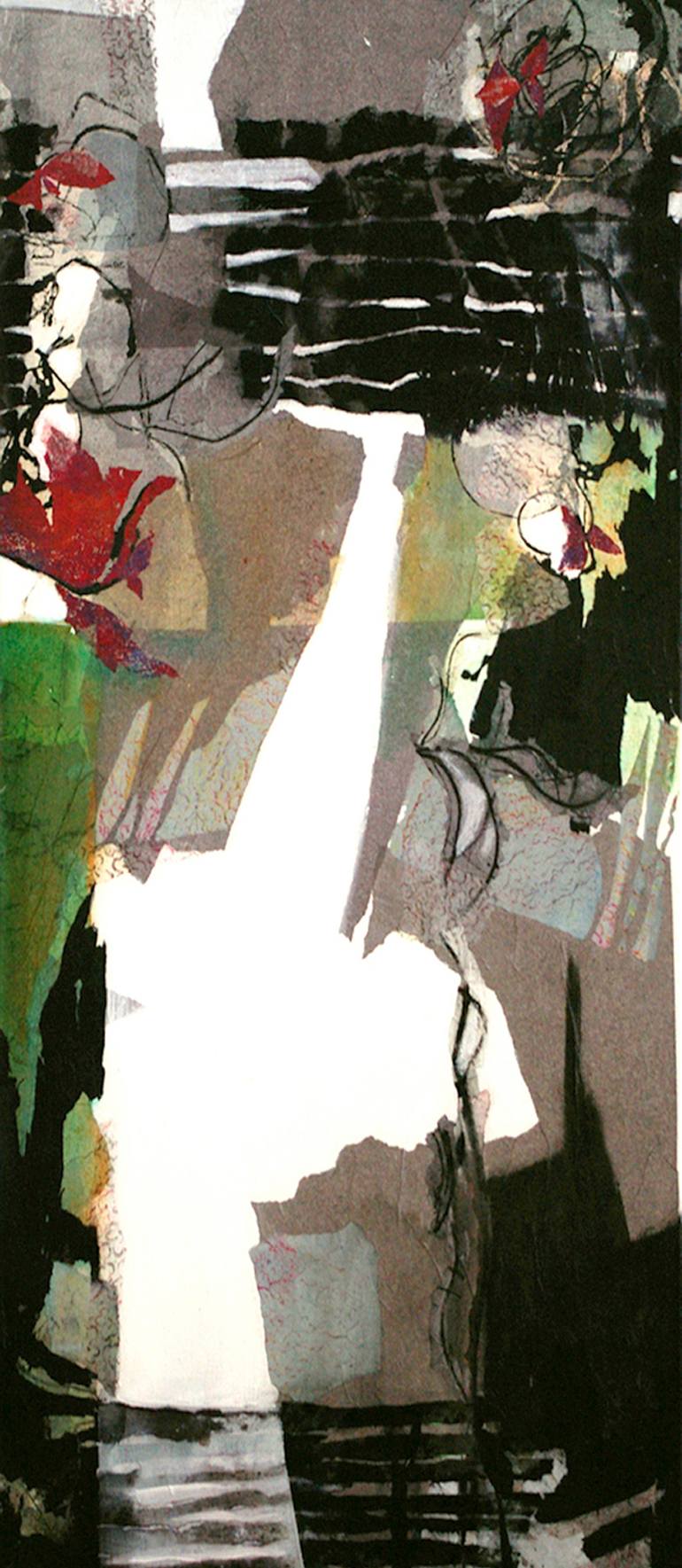Curiosity is the key, observation leads to discovery. Born in Cornwall UK.Helen Hill later studied Fine art at Central School of Art and Design, London. In 1980,she settled in France where she works and exhibits, now living in the Dordogne in the south west. Her upbringing was near St Ives until the age of 17, much influenced by her ceramist mother, Barbara A.Hill and Cornwall with it's 20th century art and ceramic history. She is inspired by the abandoned mining area along the coast together with the exceptional Cornish light, renowned for many centuries by numerous famous artists. “I’m consciously inspired by landscapes, a view from a window, a stroll through the woodlands or a glimpse through garden vegetation, those of Périgord with its multi-facette forests, of my beloved Cornwall and its now abandoned mines and the undulating pasture land of the Limousin area. Light flickering, sparkling on water, filtering through the woodland undergrowth or menacing skys inspire me to transcribe the emotion felt. The forests of the Dordogne and the calm softness of the Limousin area can be found in my work. My love of nature in all it's forms and the wonder it inspires is my principle driving force and reason for creating. I'm constantly looking for a way of conveying this uplifting sentiment in my work" Collage has always been her principal technique. Paper, all sorts of paper but it must be supple, worked on, reworked on, before starting the composition. Helen Hill creates graphic images on the paper with a theme or subject in mind, however, it’s possible on occasion to be inspired by an area of a prepared piece of paper. Her prints, etchings, monotypes and rubbings are all to be found in the collages all torn up : certain patterns can be be found repeated, reworked but never exactly the same. After the paper preparation, it’s a question of choosing certain areas and tearing them out of the sheets, assembling, composing the collage to create the final work. Collage allows her to build the composition, adding bit by bit, little by little. Mistakes don’t exist, it’s just a question of certain pieces of paper being inappropriate in a given context, so, they become simply partially or totally hidden. The paper preparation step is the creation of a language : words to be chosen and reassembled to create complete text “poems” / ”invitations”.