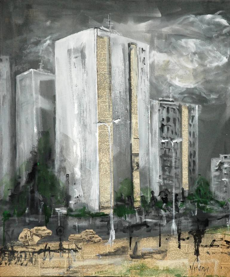 inside life under the apartment block-view from traffic. I used old newspaper from1961 as a basis on canvas because the life of apartments started when