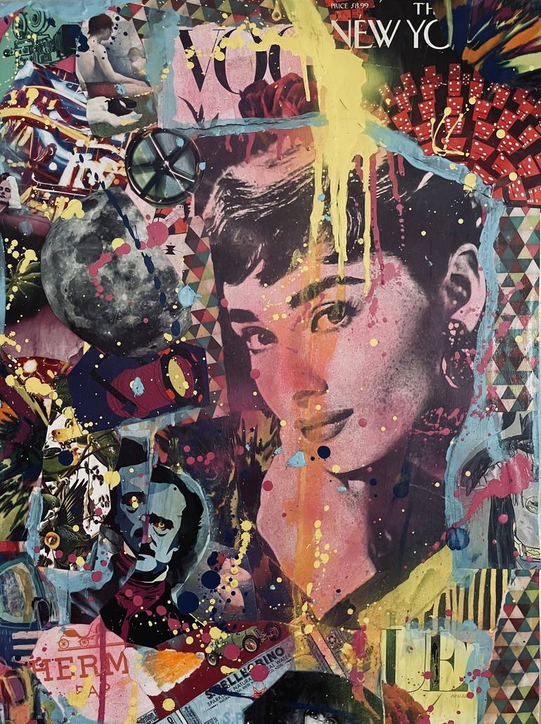 Audrey Hepburn, 2021. Collage, mixed media, on canvas. Spray paint, acrylic, pigment, oil stick, glue, latex, tabloid paper, and fine art cotton rag paper. 16 × 20in 40.56 × 50.8cm Original work 1/1 Frame not included.