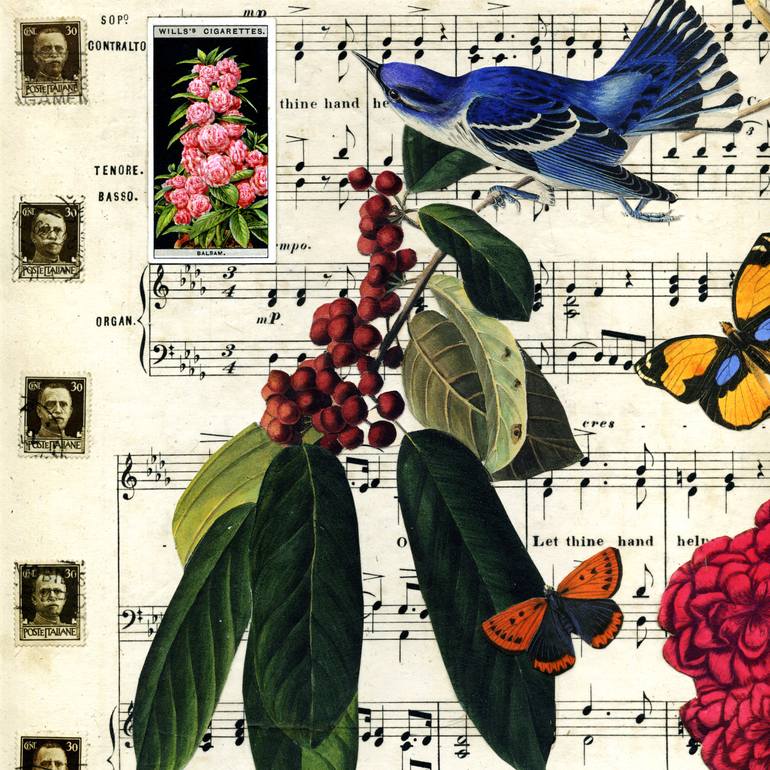 Birds, Blossoms and Butterflies No. 1, was Inspired by the wonders, sounds and sights of nature. Vintage sheet music is adorned with a illustration of a Cerulean Warbler from John James Audubon's Birds of America, a red blossom and two colorful butterflies. There are also 5 vintage Italian Stamps a...