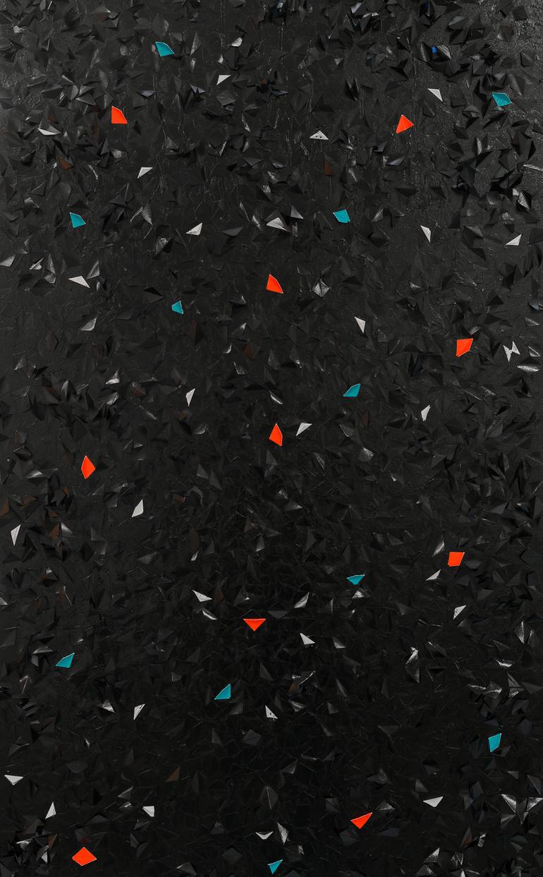 I like the use of texture in my work. This piece invites the viewer to want to reach out and touch it. I've used a variety of paints from acrylic to spray paint for the desired background. The hand cut paper and tape pieces have been introduced to the piece to bring a little color to the shinny dept...