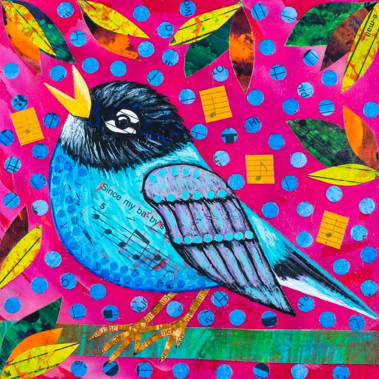 I love birds and want to capture the moment of a robin singing his song. It feels happy and cheerful. I enjoy collage the and the intricacy of putting it all together.