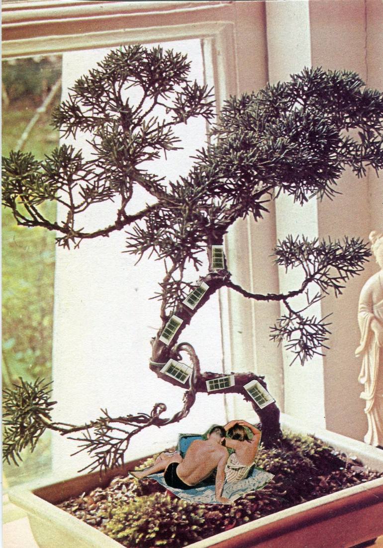 Inspired by fairies. Bonsai tree with windows on it. Handmade collage using vintage photos.
