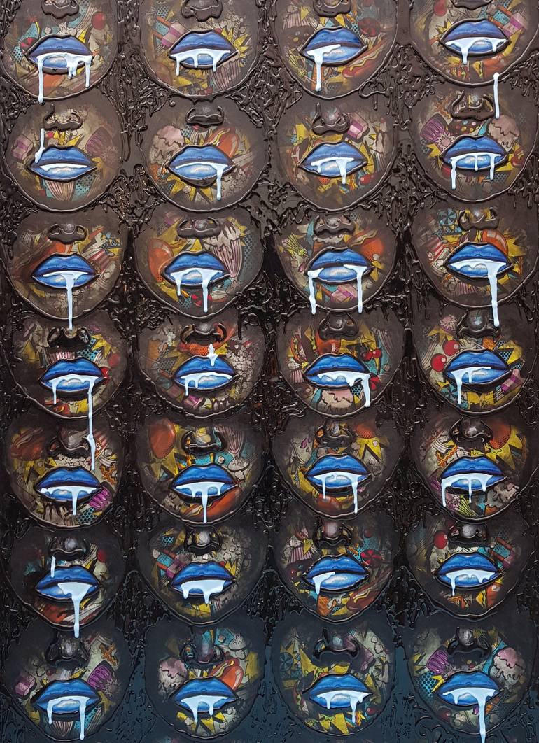 This artwork is a collage out of fabric by Alexander Henry, Postcards, hot glue and acrylic colour. It is a revision of a former version, that showed different colours. Golden outlines turned black and to work with better contrast, green turned into a light blue that harmonizes with the blue lips. ...