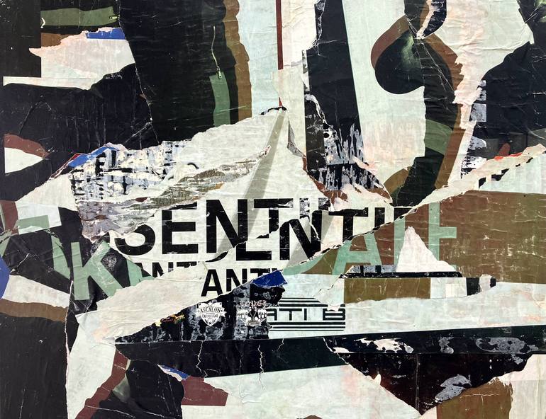 This original collage, CTL15, is part of a series born from distressed posters collected in the historic heart of Paris, Le Chatelet. The artist has carefully created a compelling abstract composition. The textures and colors, dominated by blacks and browns, reveal the history of the materials. Del...