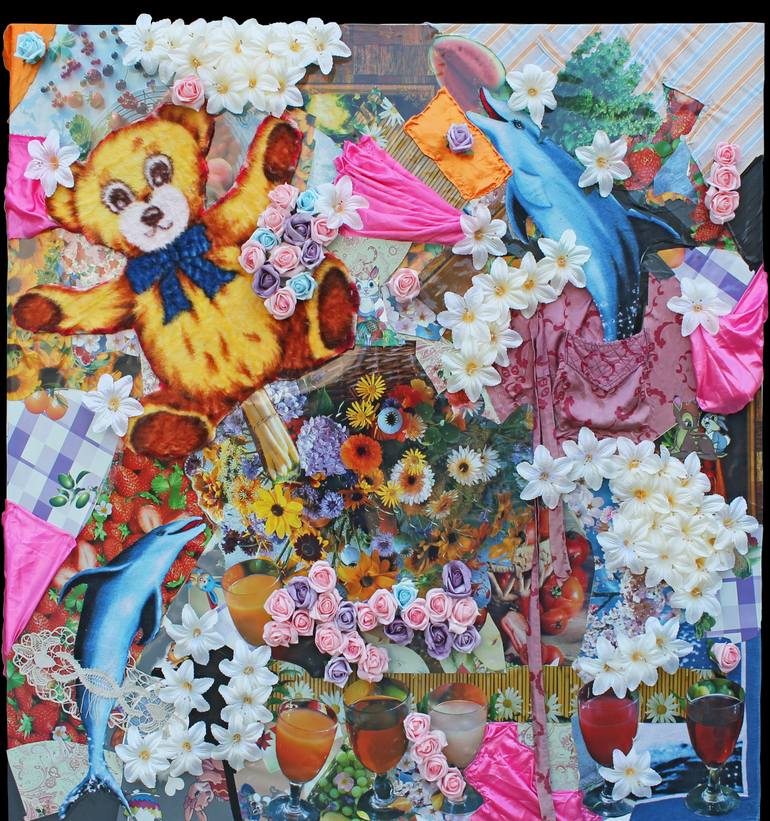 The Camaro Bear is a special species of being. It loves attention and loves to live in a jolly colored place. It's a love thing. Flowers and dolphins and kitchy materials all come together and compose this incredible image. Out of a vivid and eye-scratching background - made up of flowers, fruits an...