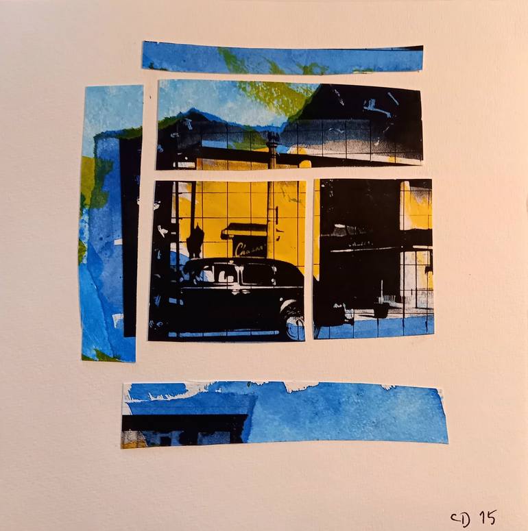 The work is an arrangement of a cut out inked photo of Chasen's Restaurant in the 1940s in blue and yellow.