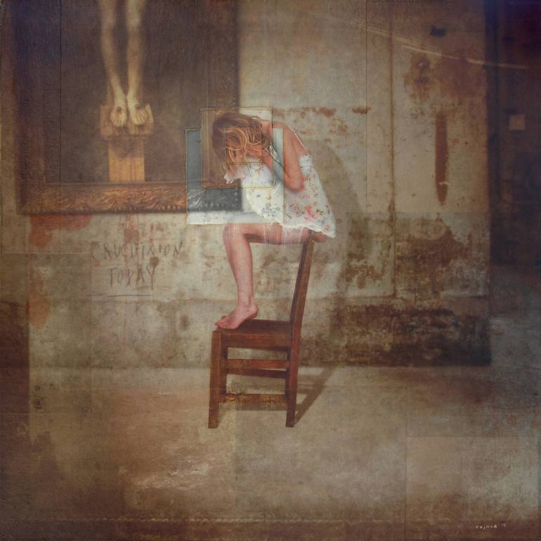 My studio is a tiny storefront, on the main street in small town, in south France. I sit in the back and make my pictures, In front I hang them on the wall and I open the door. People come in and ask what is it that I am creating. I respond, it’s anything you want it to be. No matter what, you will always view it through the prism of your own experience. ... And so they ask, ... but what is it for you? I answer, ... I don’t really know. It comes out this way on it’s own. It’s pushing itself through, like ... it needs to be done. I am just an instrument, channelling it down to the paper. To the paper, because it’s too late for me to learn to sculpt or play a violin. I can say just this little, it’s not about here and now. It’s about collisions of nostalgia, melancholy, of our sepia tinted past and ... yes, ... the future, with the cold, uninspiring present. I compose my pictures from elements, like a puzzle. I print them to different papers, collage to canvas, wood or other papers. I varnish them, I sandpaper them and varnish them again. I am making objects destined to live, and to be lived with.