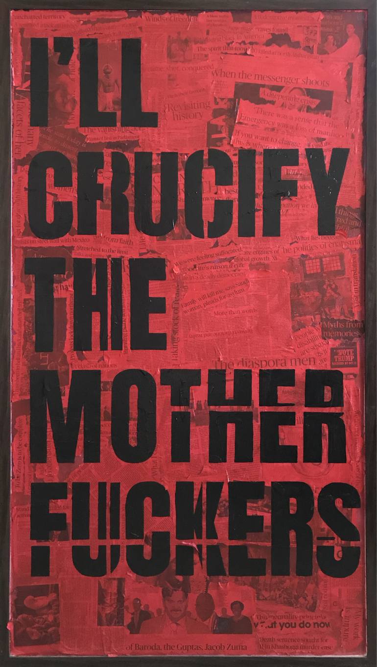 A perspective on the world in tumult. Read through the clippings, feel the angst and surrender. The red ink washes over everything and lays bare the soul of the painting.