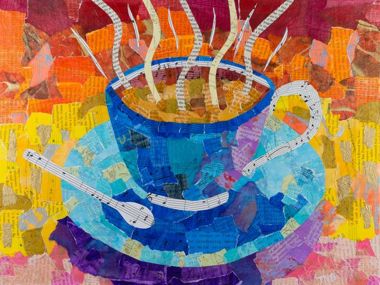 I love a hot drinks, tea and coffee and wanted to capture preparing to take a sip of a hot drink. This is collage on canvas board with acrylic torn paper ready to frame.