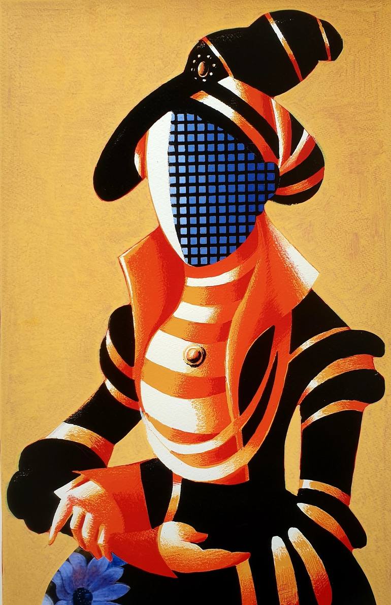 Sobre una serigrafia de cuatro colores de mancha 38 x 49,8 cm sobre papel ( Guarro Super alfa ) de 48 x 69,5 cm realizada en el año 2002. Se han realizado collage, alteraciones de color con gouache, lápices de colores.... Con estas variaciones se consigue una obra nueva que ensalza...