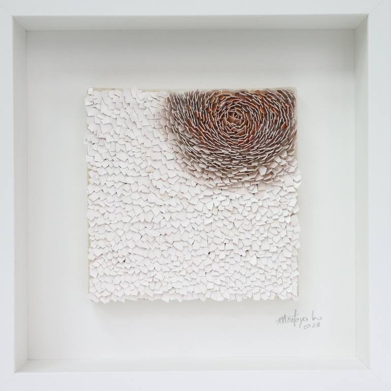 Nature provides us with complex and beautiful forms and materials, and we humans use and discard them. I like to take some of those natural "left overs" and dispose the pieces to make different compositions. In this piece I am using eggshells from my kitchen.