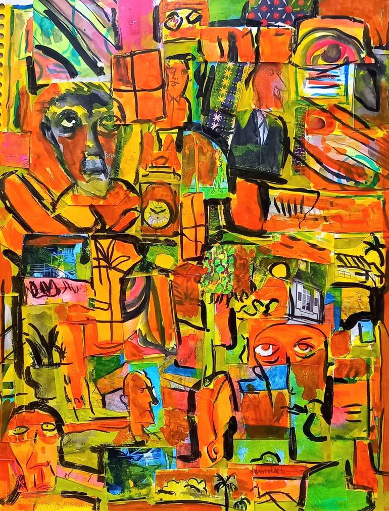 This collage with ink and gouache on different shaped cut outs aims to capture the density and intensity of city life.