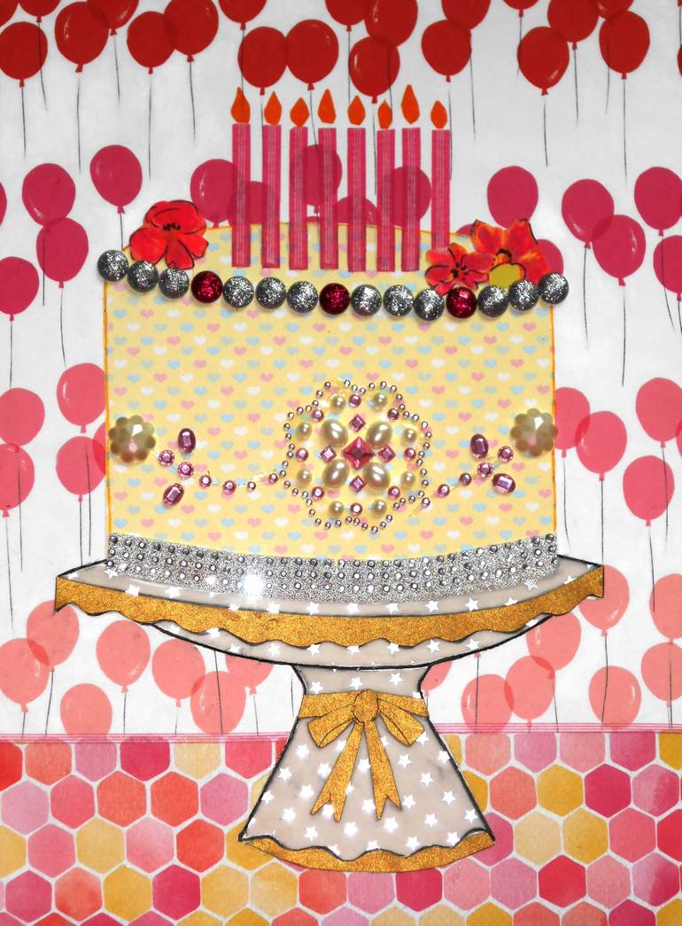 When my son was two, he referred to the birthday cake I made for him as a “happy cake” because he couldn’t say “birthday”. He’s 42 now and he’s learned how to say “birthday”; I, however, have not learned how to make a cake as fancy as the one I’ve created for this whimsical artwork.