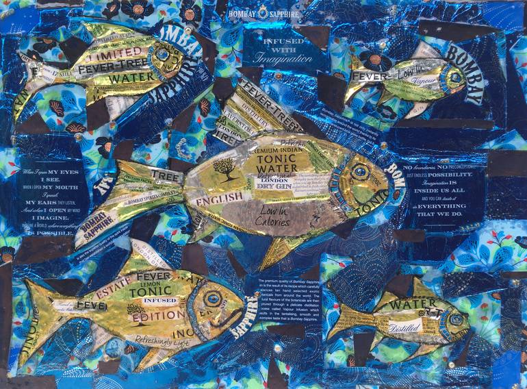 A glass chopping board. This was a featured piece of art called Fin And Tonic which I made by soaking off the labels from bottles of gin and tonic and rearranging into a glistening school of fish. . My local pubs have been amazing in saving all their empties for me and I also go round rummaging in p...