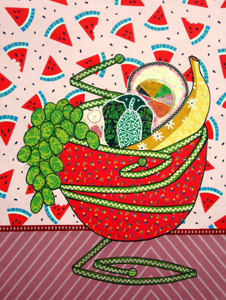 A whimsical bowl of fruit—green grapes, a banana, a grapefruit and a bell pepper—in a bright red bowl, with a watermelon background.