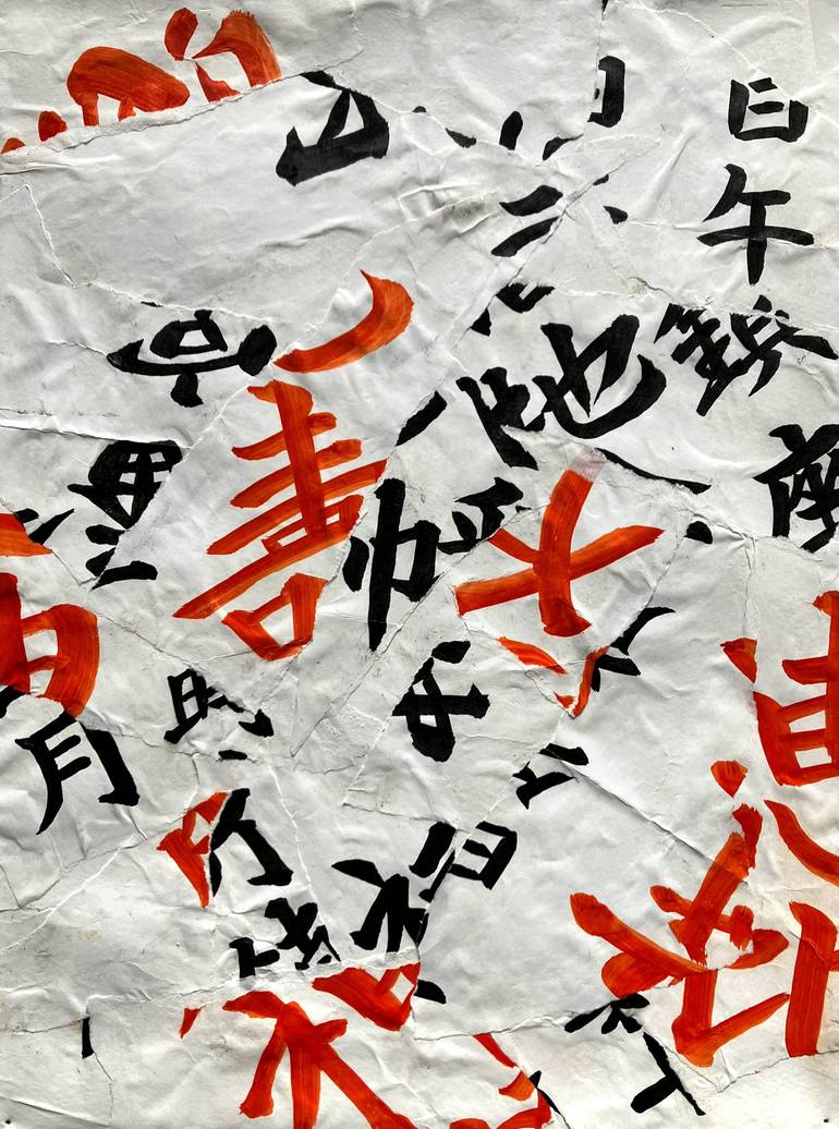 Work from the FUJI series made with elements collected during an artist residency at Fujiyoshida facing Mount Fuji. Torn hand-written posters on paper. To be framed or pinned to wall.