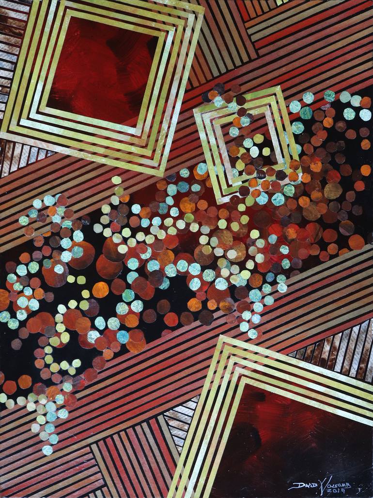 "Georges et Madeleine", 2019, acrylic and cut paper on canvas. This picture combines linear geometric architectural forms with free-flowing impressionistic patterns. The look is sharp and clear, but at the time opulent and luxurious. The title refers to Georges-Pierre Seurat and his mistress, Made...