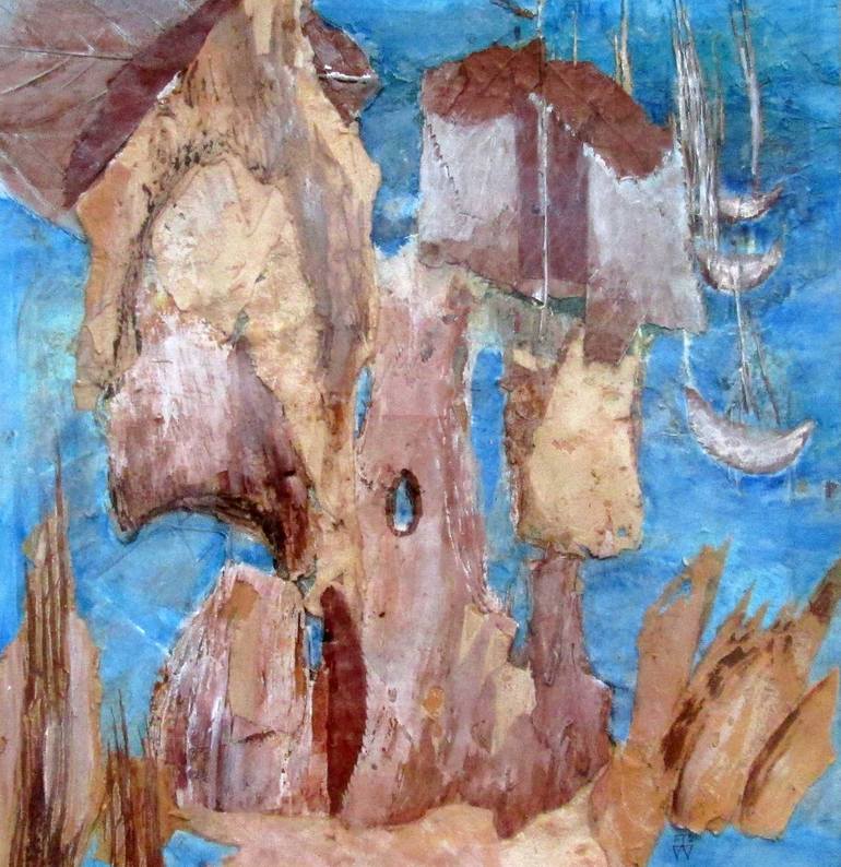 Seeing pictures of the Ha Long Bay in Vietnam, and a subsequent visit to Los Angeles I collected these soft sheets of bark that came apart in several layers. I used these to create a collage of these jagged rocks.; hence this picture emerged. The framed size is 40.5 x 38.5 cm and is ready to hang.