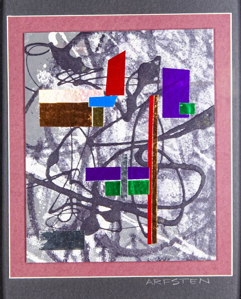 This starts out as a monotype and then collage elements are added to it. I think of the design as a diagram wor the plot of a mystery story. It is abstract so it can be anything you want. Basically it would be nice as a conversation starter to entertain your viewer. It is framed in a wood frame wit...