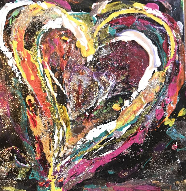 This is a body of about 15 hearts that I did 11 x 11 after I did up heart painting for my boyfriend for Valentine’s Day and then turned out so good that I went and explored texture in all different kinds of sparkles and medium love it !!!